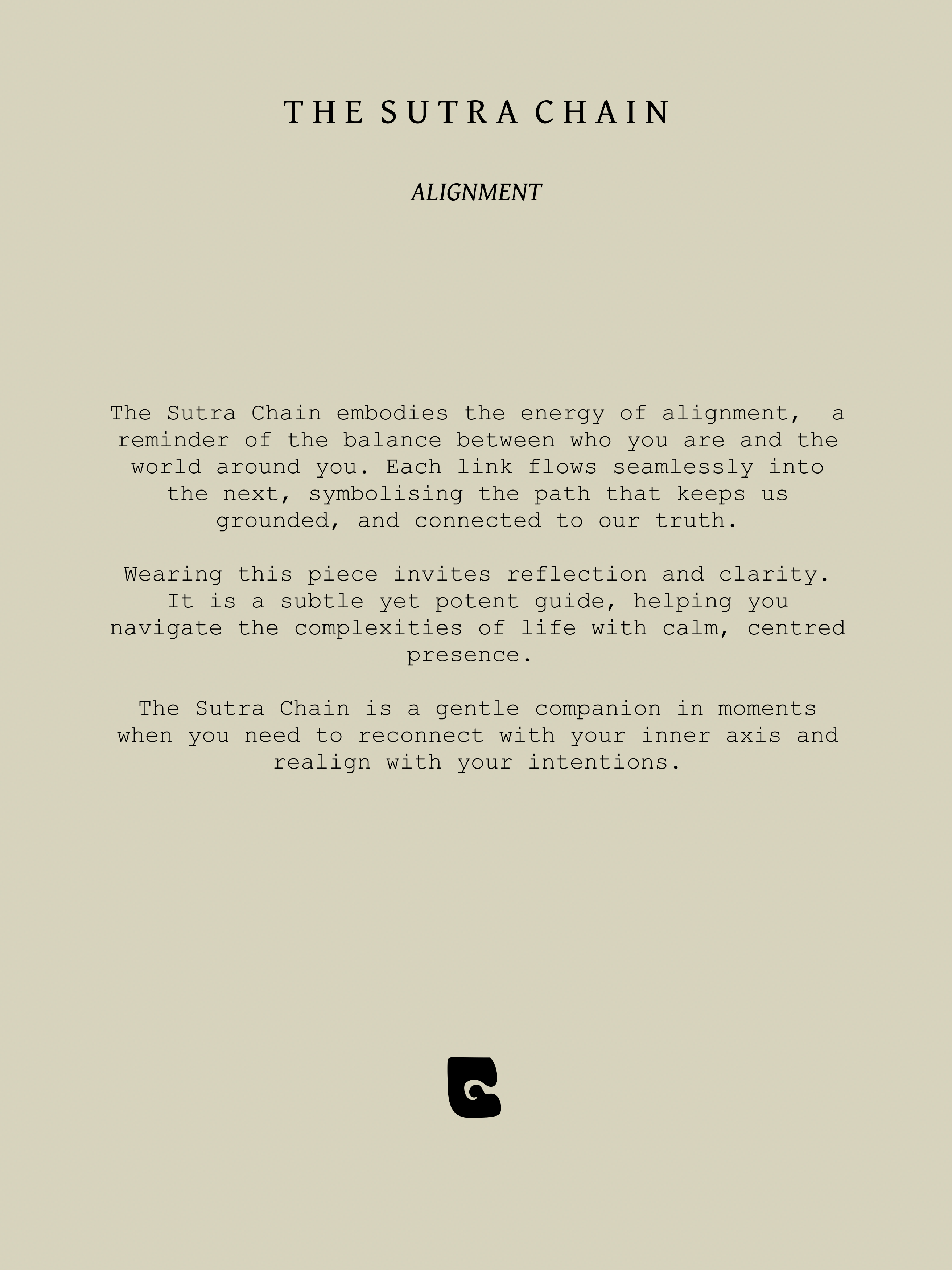The Sutra Chain channels the energy of alignment, designed to keep you centred and grounded in your truth. This piece is a 75 cm small link chain. Available in sterling silver or 10k gold-vermeil.